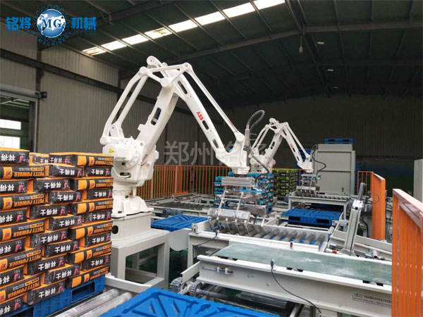 2、 相比較高位碼垛機,碼垛機器人占地面積少,布局靈活,可以設(shè)置在狹窄的空間,即可有效的使用。